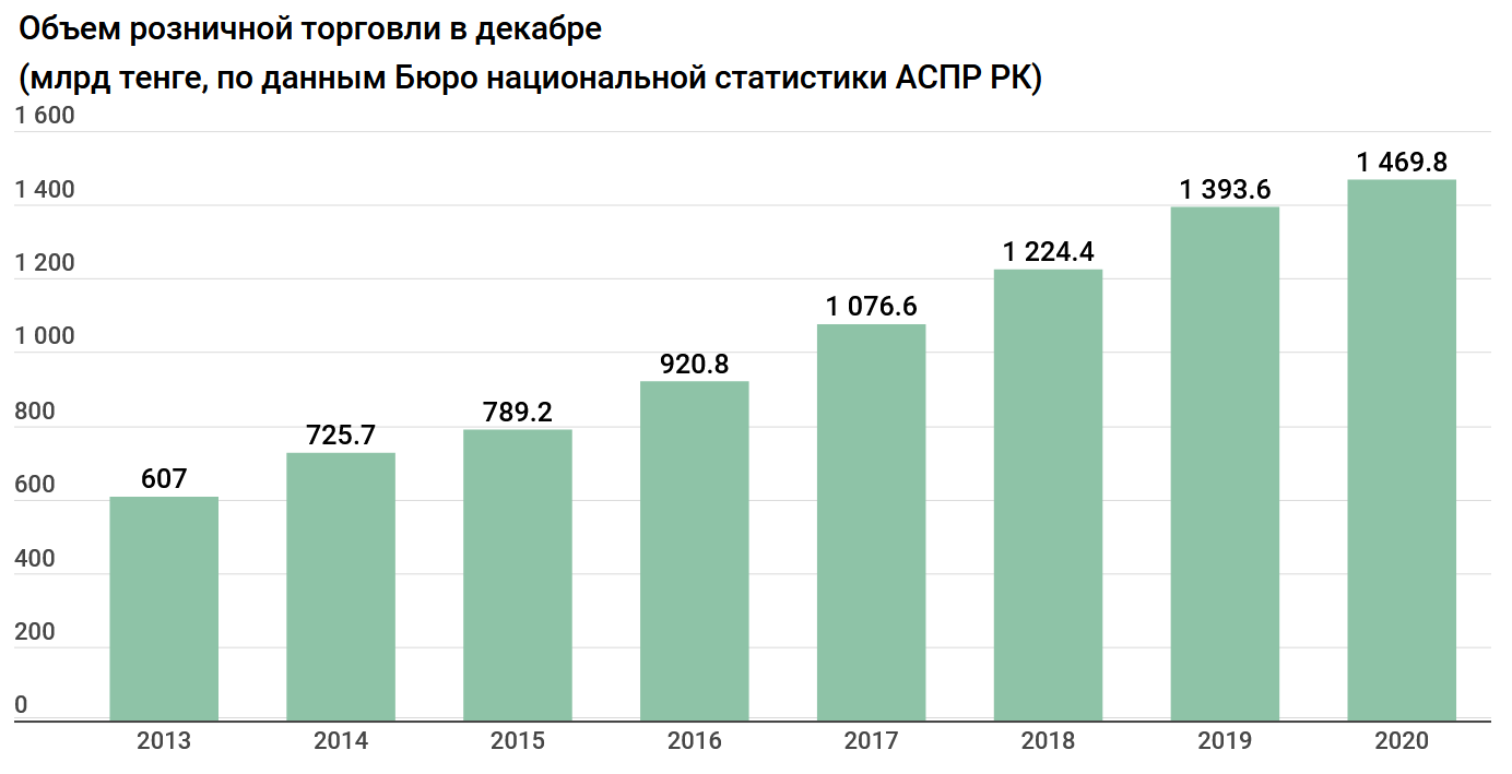 - Декабрь стал 5-ым месяцем подряд, когда объем розничной торговли превысил 1 трлн тенге – раньше ничего подобного в истории Казахстана не было