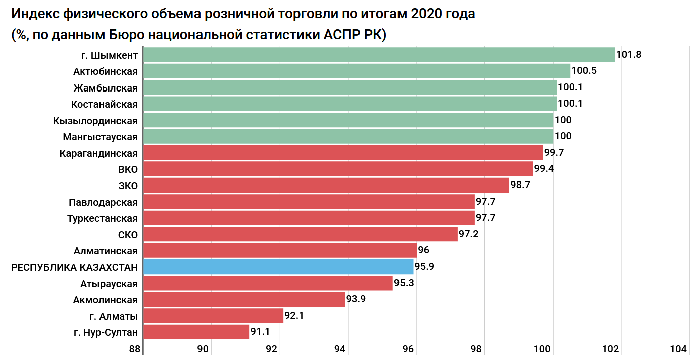 Рекорды розничной торговли были побиты в 14 из 17 регионов республики. Исключениями стали Актюбинская (82,2 млрд против 83,8 млрд в июле 2020-го), Туркестанская (17,7 млрд против 18,6 млрд в июле 2020 года) и Северо-Казахстанская (27,8 млрд против 30,3 млрд в декабре 2018-го) области.