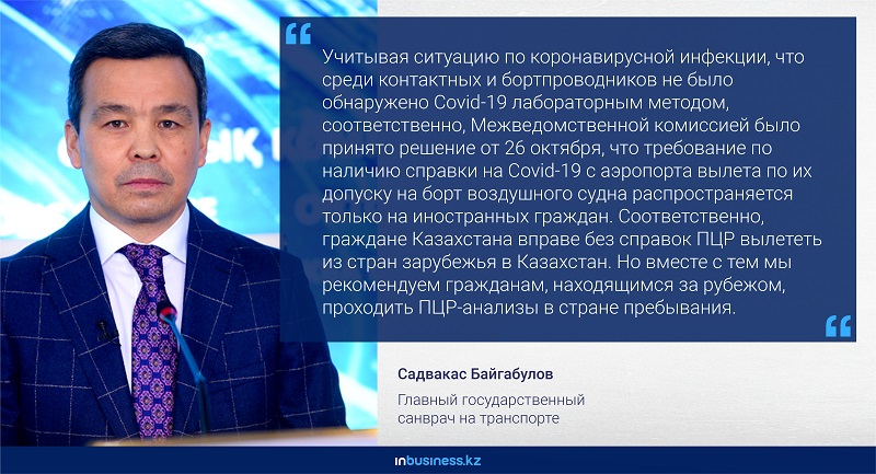 "Учитывая ситуацию по коронавирусной инфекции, что среди контактных пассажиров и бортпроводников не был обнаружен COVID-19 лабораторным методом, соответственно, межведомственной комиссией было принято решение от 26 октября, что требование по наличию справки на COVID-19 с аэропорта вылета и допуску на борт воздушного судна распространяется только на иностранных граждан. Соответственно, граждане Казахстана вправе без ПЦР-справок вылететь из стран зарубежья в Казахстан. Но вместе с тем мы рекомендуем гражданам, находящимся за рубежом, сдавать анализы в стране пребывания. На сегодняшний день в странах ближнего и дальнего зарубежья не составляет никакой проблемы сдать ПЦР-анализы. В международных аэропортах, отелях и городах имеются пункты забора, анализы предоставляются в течение суток", – сказал Байгабулов.