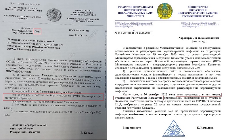 Тем временем 23 октября главный санврач страны Ерлан Киясов издает постановление № 59 "об усилении мер в пунктах пропуска на госгранице", в котором обязывает всех прибывших в аэропорты РК пассажиров предоставить справку о прохождении теста на коронавирус. Исключение – дети до пяти лет, дипломаты и члены правительственных делегаций. Вступить в силу ограничения должны с 27 октября, но накануне и в этот день правила меняются дважды. Санврач на транспорте Садвакас Байгабулов выступает на брифинге в СЦК, где объявляет, что наличие справки у граждан Казахстана отныне лишь "рекомендация", только если они готовы на тест по прибытии и двухдневное ожидание в карантинной зоне. Обязанность же иметь справки до вылета сохраняется только для иностранцев. А смягчили требование не потому, что оно нарушает Конституцию, об этом в рамках брифинга ни слова, а потому, что к тому есть благоприятные предпосылки.