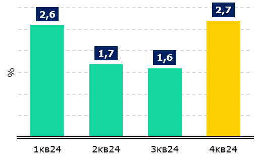 В первую половину 2024 года темпы роста экономики показывали существенное замедление – 3,8% г/г в первом квартале и 3,3% г/г за первые 6 месяцев года. Тогда такое замедление было довольно закономерным – сильно ослабла динамика горнодобывающего сектора, который стимулировал рост в 2023 году; существенно снизились инвестиции в основной капитал, а довольно жесткие монетарные условия ограничивали темпы роста кредитования, особенно корпоративного.