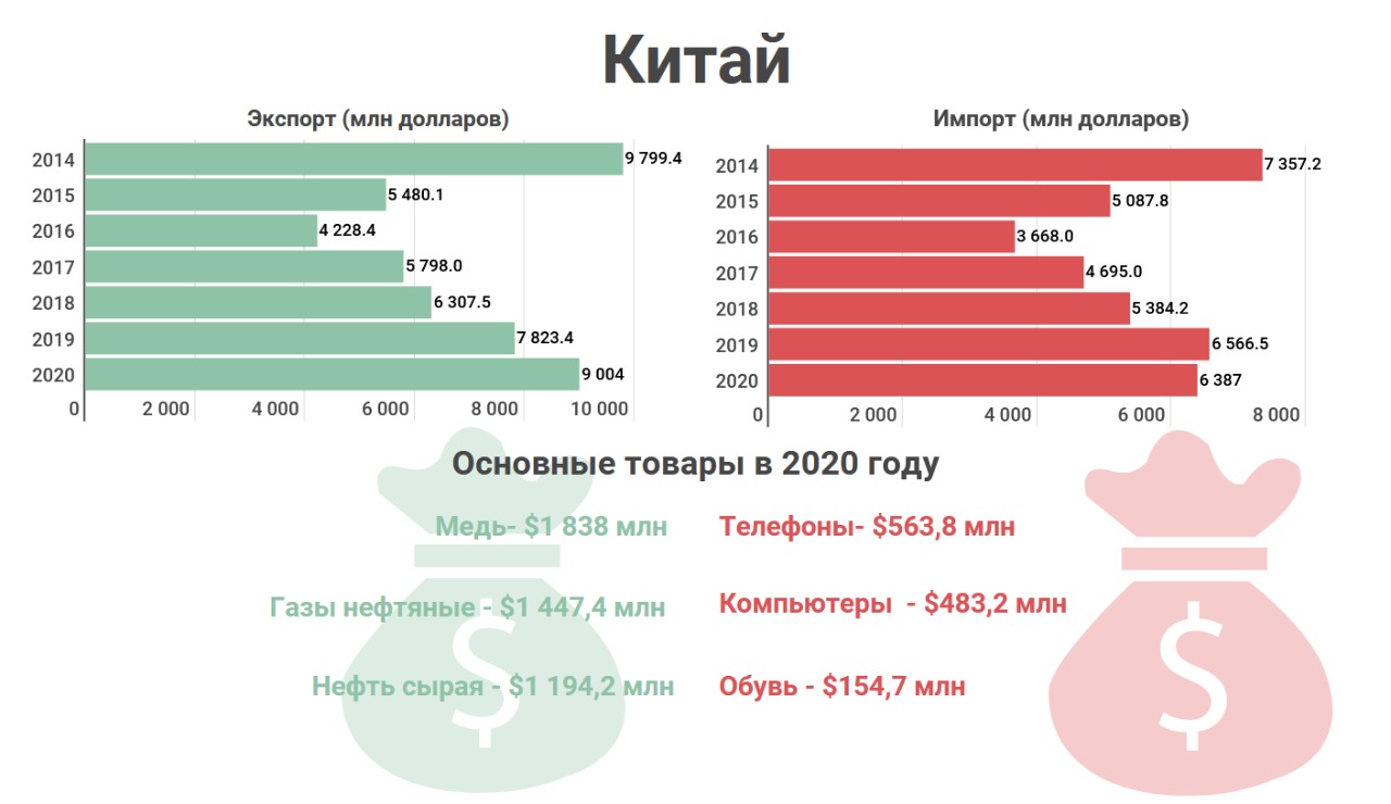 Экспорт в Китай растет четвертый год, превысив 9 млрд долларов, это наибольший показатель с 2014-го. Произошло это за счет роста продаж сырья. В 2020-м Казахстан продал Китаю меди более чем на 1,8 млрд долларов, газа – более чем на 1,4 млрд долларов, нефти – почти на 1,2 млрд долларов.