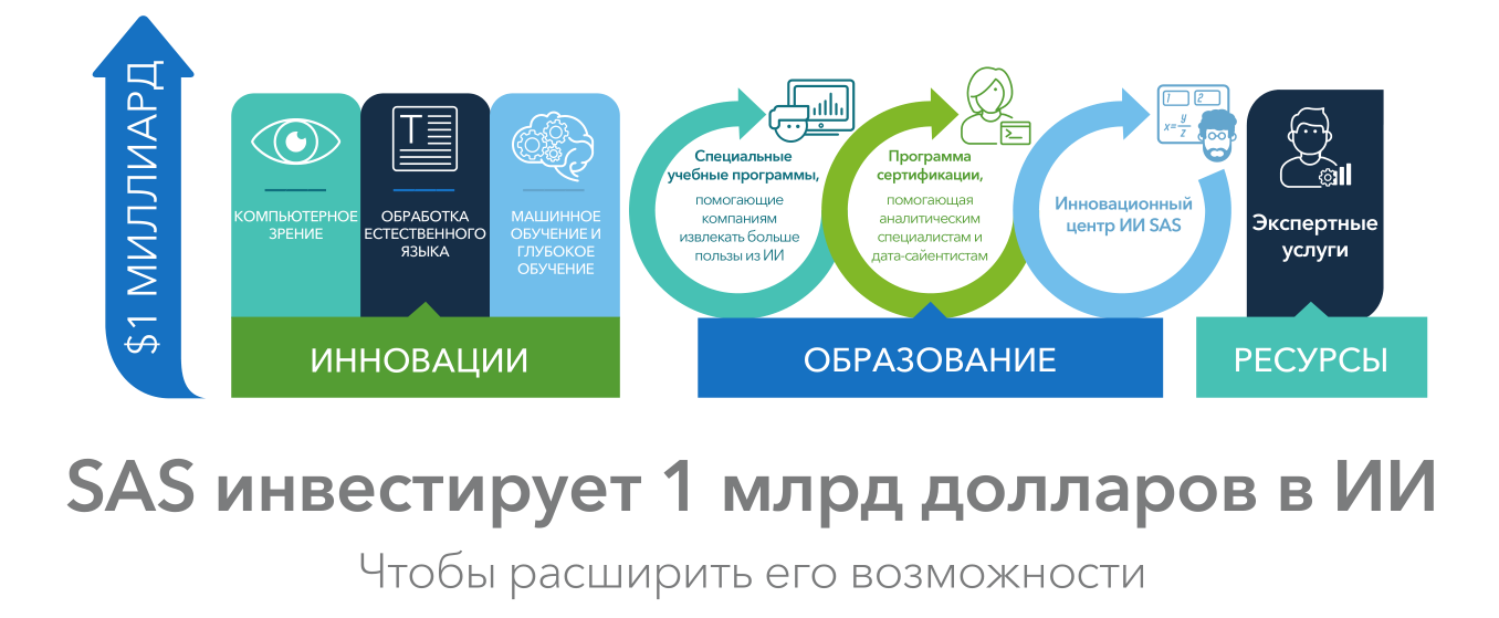 Компания SAS, ведущий игрок на рынке бизнес-аналитики, инвестирует 1 млрд долларов в технологии искусственного интеллекта в течение ближайших трех лет. Инвестиционный план предполагает разработку и внедрение новых программных решений, образовательных программ, экспертных сервисов и пр. План будет воплощаться в жизнь на основе прочного фундамента – в этой роли выступают уже существующие наработки SAS в области искусственного интеллекта, в том числе всемирно признанные инструменты для углубленной аналитики, машинного обучения, глубокого обучения, компьютерного зрения и обработки естественных языков (NLP). Образовательные программы и экспертные сервисы, предназначенные для руководителей предприятий и специалистов по работе с данными, позволят совершить плавный переход к искусственному интеллекту будущего.