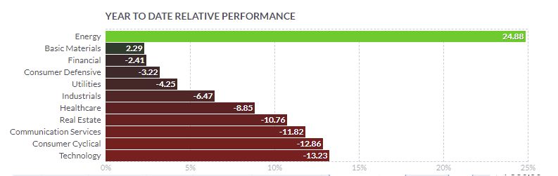 Американский техсектор вовсе является наиболее просевшим среди все остальных секторов. Чуть более чем за два месяца он упал на -13,23%. Лидером же предсказуемо является энергетический сектор, который с начала 2022 года вырос уже почти на +25%. Нефтегазовые компании являются главными бенефициарами нынешнего геополитического кризиса в связи с рекордными ценами на энергоносители.
