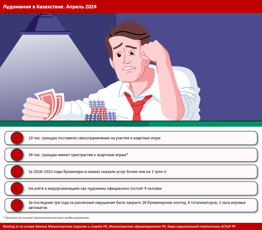 Реальная численность казахстанских лудоманов — людей с психиатрическим заболеванием — неизвестна. Зато стало ясно, сколько граждан сами видят в себе признаки лудомании. С 18 марта в РК в пилотном режиме действует онлайн-услуга по самостоятельному ограничению себя в участии в азартных играх и пари. Ее легко можно подключить через мобильное приложение eGov mobile. По данным министерства туризма и спорта РК, к началу апреля самозапрет выставили более 7 тыс. казахстанцев. Еще 3 тыс. человек написали заявление об ограничении приема ставок в бумажном виде. Итого только за две недели численность игроков, признавших у себя проблемы, превысила 10 тыс. человек.