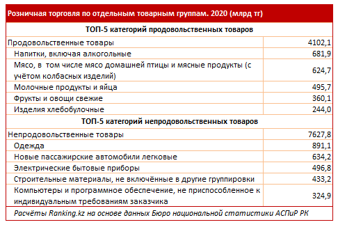Непродовольственные товары составили 65% от общего объема розничной торговли, или 7,6 трлн тг — на 1,8% меньше, чем годом ранее. Здесь наибольшие суммы пришлись на одежду (891,1 млрд тг), новые легковые автомобили (634,2 млрд тг) и электрические бытовые приборы (496,8 млрд тг).
