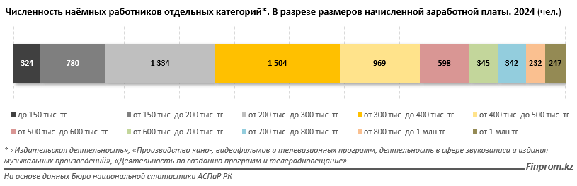 Вот какие результаты показало распределение численности работающих в трёх категориях ("Издательская деятельность", "Производство кино-видеофильмов и телевизионных программ" и "Деятельность по созданию программ и телерадиовещание") по размеру начисленной заработной платы. 16,5% всех наемных работников в этих группах в 2024 году получают зарплату до 200 тыс. тенге, 20% зарабатывают от 200 тыс. до 300 тыс. тенге, ещё 22,5% приносят домой от 300 тыс. до 400 тыс. тенге. Суммарная доля тех, чья зарплата не достигает или едва достигает уровня средней по экономике, составляет 59,1%.