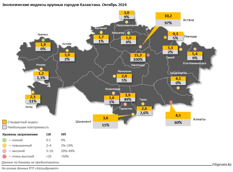 Вот как выглядела экологическая ситуация в казахстанских областных центрах в октябре текущего года. Низким уровнем загрязнения могли похвастать только Кокшетау и Уральск. В 11 из 19 городов, представленных в отчётах РГП "Казгидромет", загрязнение атмосферного воздуха в октябре было повышенным. К такому выводу специалисты ведомства приходят на основе экологических индикаторов — стандартного индекса загрязнения (СИ) и его наибольшей повторяемости (НП). Те, в свою очередь, зависят от того, сколько раз на постах наблюдения фиксировалось превышение ПДК загрязняющих веществ и насколько серьёзным оно было.