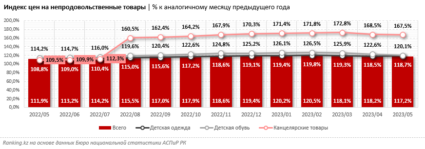 Судя по индексам потребительских цен, детская одежда, обувь и канцелярские товары дорожают больше, чем в среднем непродовольственные товары. Так, если в мае этого года инфляционный показатель для этой укрупненной группы составил 117,2%, то для детской одежды он достигал 118,7%, для обуви — 120,1%, для канцтоваров — 167,5%.