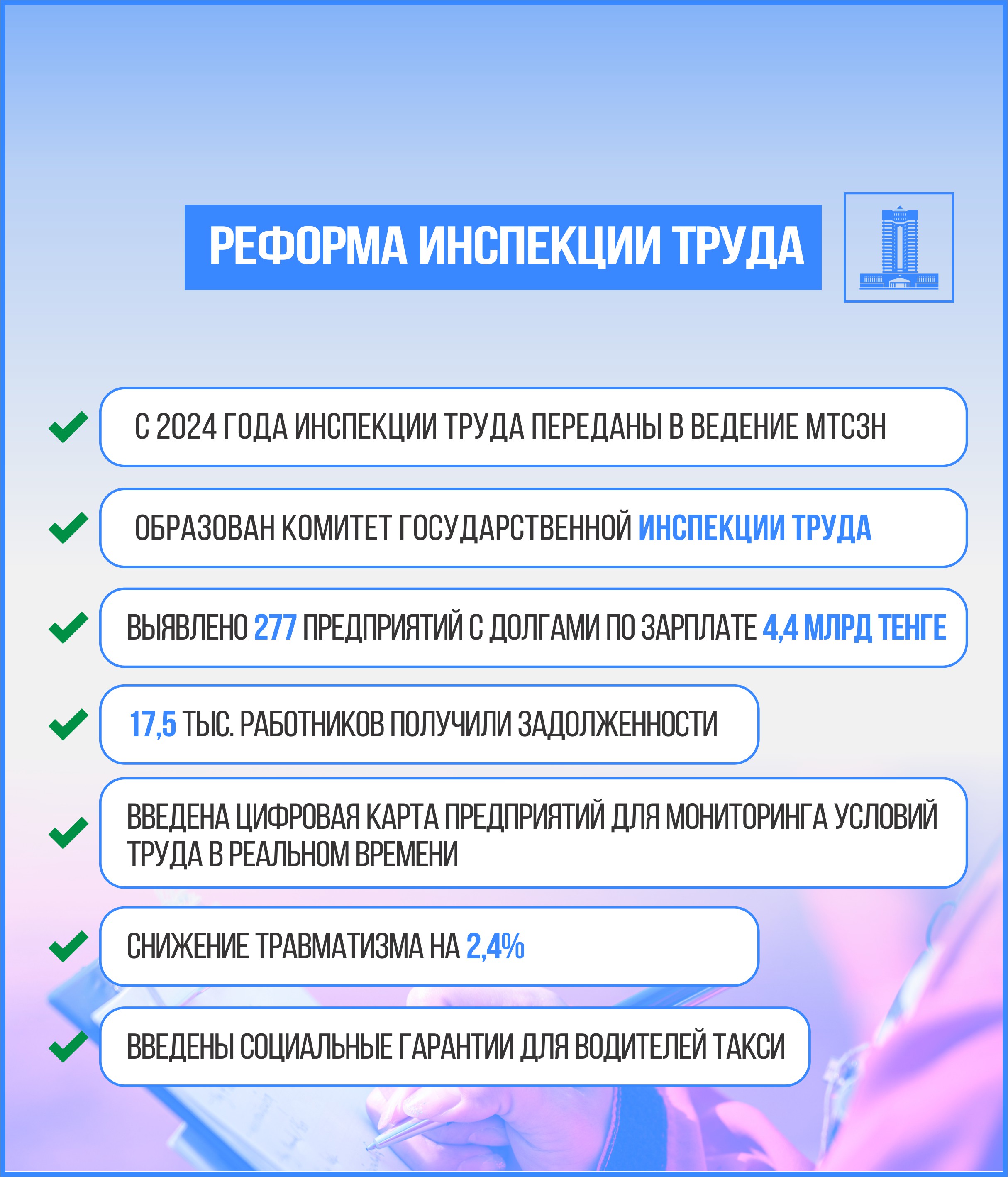 В 2024 году министерство предприняло значительные шаги для улучшения трудовых условий и защиты прав работников. Одним из важных достижений стала передача инспекции труда из местных исполнительных органов в ведение министерства. Был создан комитет государственной инспекции труда с его территориальными подразделениями. Это позволило создать независимую вертикаль контроля за соблюдением трудового законодательства.