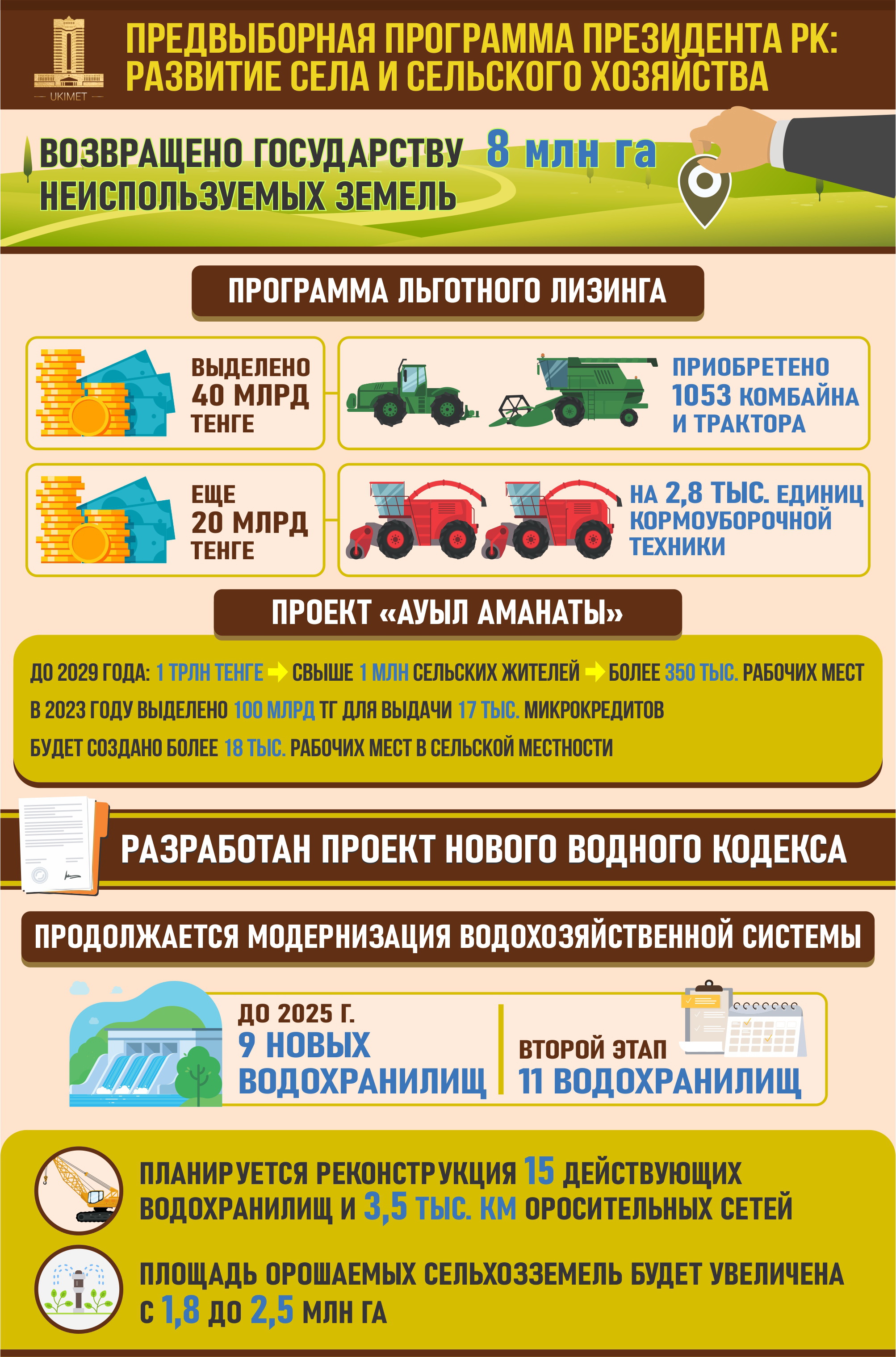 Как отметил глава государства, предстоит внедрить эффективные водосберегающие технологии, восстановить систему мелиорации и ирригации. Наряду с этим государство реализует масштабный проект по организации сельхозкооперативов.