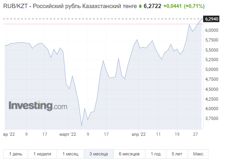 С начала нынешней недели рубль укрепился к доллару почти на 5,4 рубля – с 75,85 рубля за доллар. В то же время российская валюта демонстрирует и значительное укрепление у тенге. За неделю курс рубль/тенге вырос еще на 30 тыин и на данный момент достиг 6,27 тенге за рубль. В начале недели он вовсе слабел до 6,31 тенге за рубль, что является историческим максимумом.