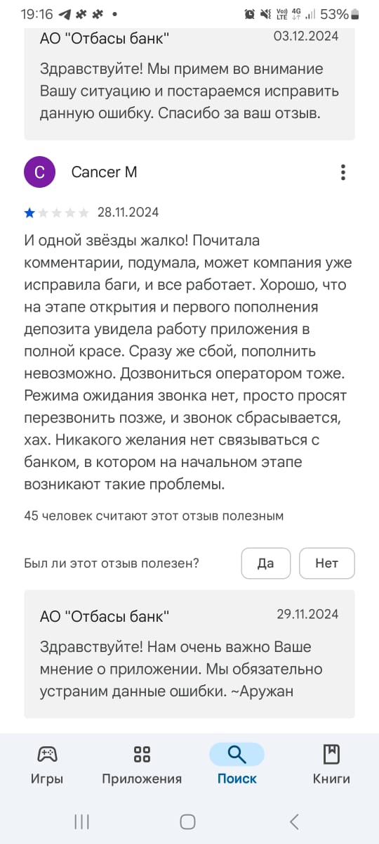 Google Play просто разрывается от гневных комментариев. Многие пишут, что приложение ужасно написано, постоянно вылетают способы авторизации по биометрии и коду-паролю. Кроме того, приложение не показывает сумму, которую пользователь отправил на счет. В ответ на весь негатив сотрудники банка реагируют с должным спокойствием, говоря, что разрабатывается новая версия приложения Otbasy bank Lite.