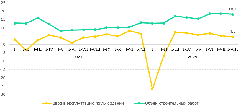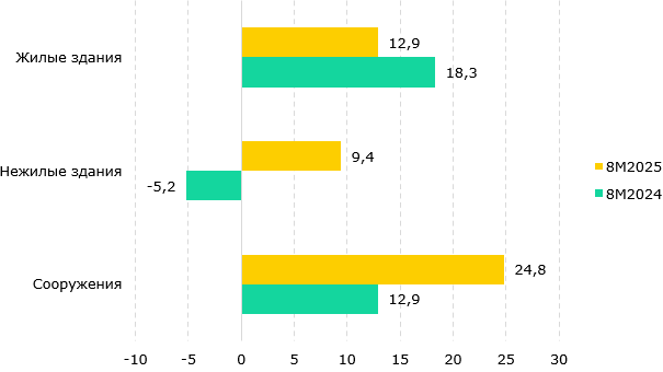 В январе-августе 2025 года темпы роста строительства жилых зданий продолжают замедляться, демонстрируя рост в 12,9% г/г против 18,3% г/г в январе-августе 2024 года. Объем работ по строительству нежилых зданий увеличился на 9,4% г/г после значительного падения в январе-августе прошлого года (-5,2% г/г), строительство различных инженерных сооружений продолжает демонстрировать наиболее выраженную положительную динамику — рост на 24,8% г/г (Рис. 2).