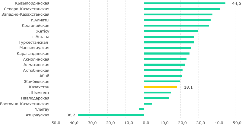В то же время в двух регионах продолжает наблюдаться спад строительной активности. Сокращение объемов вновь зафиксировано в Атырауской области (-36,2% г/г) и области Улытау (-2,7% г/г). Основной причиной столь значительного падения в Атырауской области стало завершение ряда крупных нефтегазовых и инфраструктурных проектов, ранее оказывавших заметное стимулирующее воздействие на экономику региона, включая окончание реализации Проекта будущего расширения на Тенгизе.