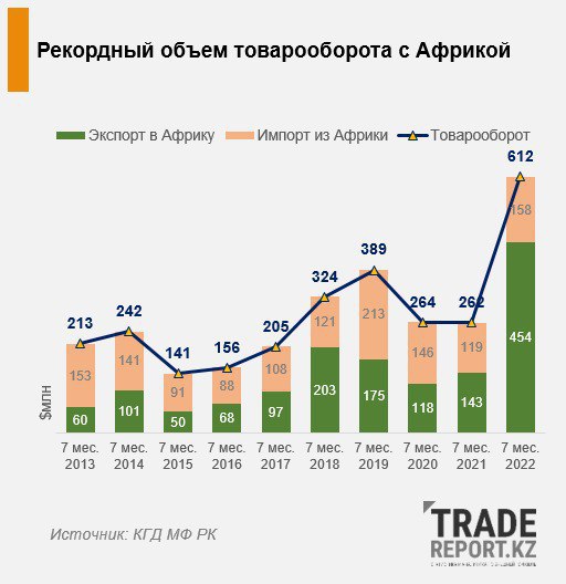Из этого товарооборота $454 млн приходится на казахстанский экспорт в Африку, а на импорт, соответственно, остальные $158 миллионов. При этом экспорт вырос в 3,2 раза, тогда как объемы импорта всего на 32%.