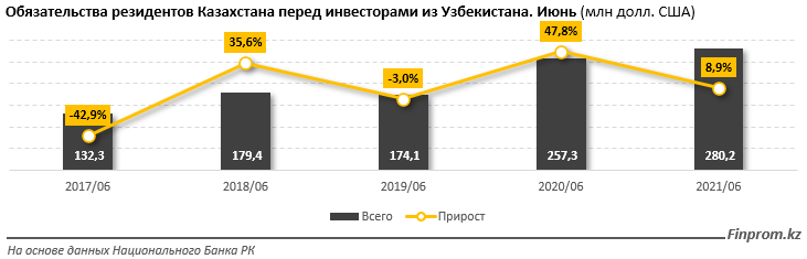 Обязательства резидентов Казахстана перед инвесторами из Узбекистана на 1 июля текущего года составили 280,2 млн долл. США – на 8,9% больше, чем годом ранее.