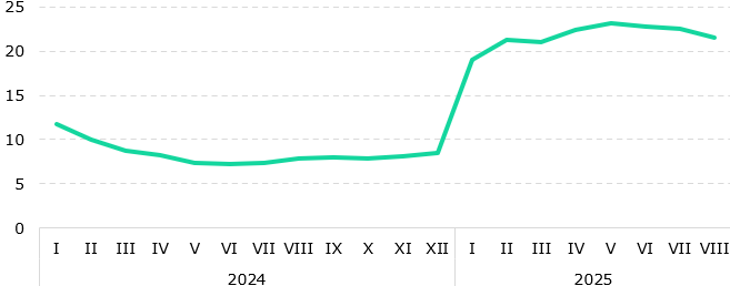 Согласно предварительным данным, за восемь месяцев 2025 года рост ВВП достиг 6,5% г/г. При этом наиболее высокая динамика зафиксирована в транспорте (+21,5% г/г), который продолжил демонстрировать двадцатизначные темпы роста на протяжении всего года (Рис. 1).