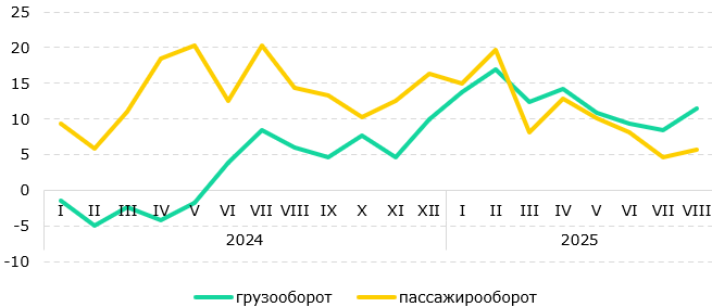 Основной вклад в прирост отрасли обеспечил грузооборот, опережающий по динамике пассажирооборот. При этом в августе показатели демонстрировали дополнительное ускорение, отражая сезонные тренды.