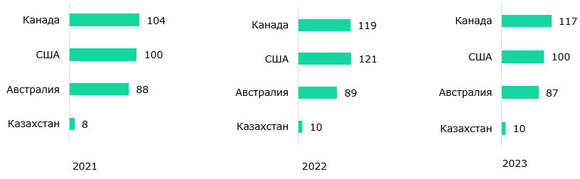 Международные исследования подчеркивают, что долгосрочный экономический рост и развитие определяются ростом производительности факторов производства. Различия в доходах на душу населения между странами часто связаны с общей факторной производительностью, отражающей эффективность объединения производственных факторов. Учитывая ключевую роль труда в этом процессе, многие страны стремятся повысить этот показатель. Наш анализ показывает, что производительность в сельском хозяйстве и обрабатывающей промышленности Казахстана значительно отстаёт от развитых стран. Например, производительность труда в сельском хозяйстве (Рис. 1) Казахстана в 2021 году составила всего 8 тыс. долларов. В Канаде, где также преобладает континентальный климат и большая территория, добавленная стоимость на одного работника сельского хозяйства в 2023 году составила 117 тыс. долларов. В Казахстане этот показатель значительно ниже – около 10 тыс. долларов, что показывает разницу почти в 17 раз. В обрабатывающей промышленности производительность в Казахстане выросла с 46 тыс. долларов в 2021 году до 53 тыс. долларов в 2023 году, но это все еще значительно ниже, чем в странах с высокоразвитой промышленностью, таких как США и Канада (Рис. 2).