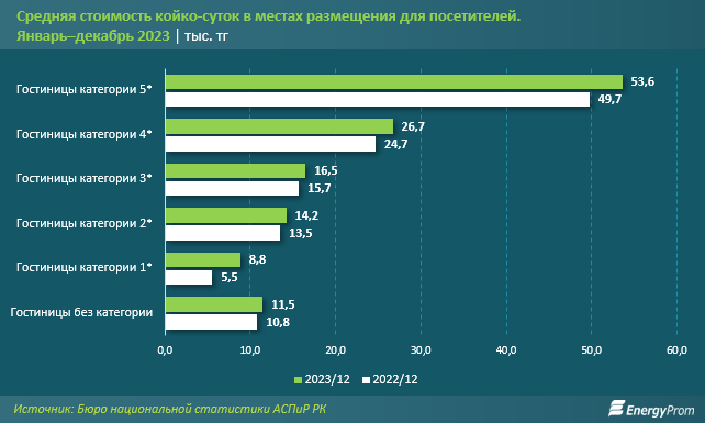 Второе и третье место по численности зарубежных посетителей — у гостиниц с четырьмя и пятью звездами. Стоимость проживания в таких отелях в разы отличалась от цен в местах размещения без категорий. Например, за койко-сутки в пятизвездочной гостинице иностранцы платили 53,6 тыс. тенге, за пребывание в обычном гостевом доме — 11,5 тыс. тенге. Ценник на эти услуги в сфере HoReCa за последний год вырос незначительно.