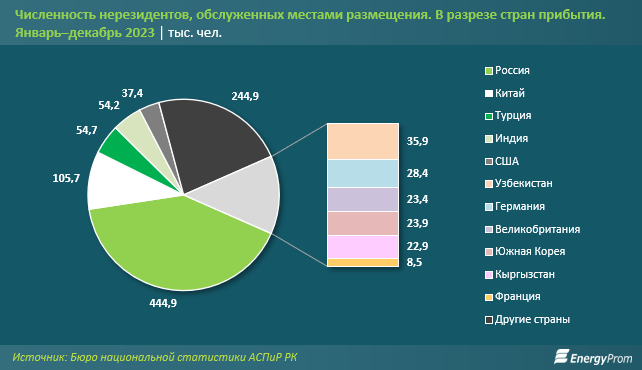 Energyprom делает оговорку, что не называет всех приезжающих в Казахстан нерезидентов туристами. Согласно данным статистиков, из 9,2 млн приезжих только 1,1 млн человек останавливались в гостиницах, хостелах, турбазах, санаториях и домах отдыха. Это лишь около 12% от общей численности. Остальные 8,1 млн человек либо снимали квартиры или дома у предпринимателей "серого" рынка аренды, либо гостили у родственников и знакомых. Из тех, кто останавливался в гостиницах, лишь меньше половины — 523 тыс. человек — посетили страну с какими-либо личными целями, не связанными с профессиональной деятельностью. Остальные иностранные визитеры приезжали в РК просто по делам.