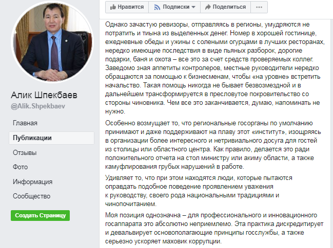 К слову, о "задушевных встречах" ревизоров на местах высказался на своей странице и Алик Шпекбаев.