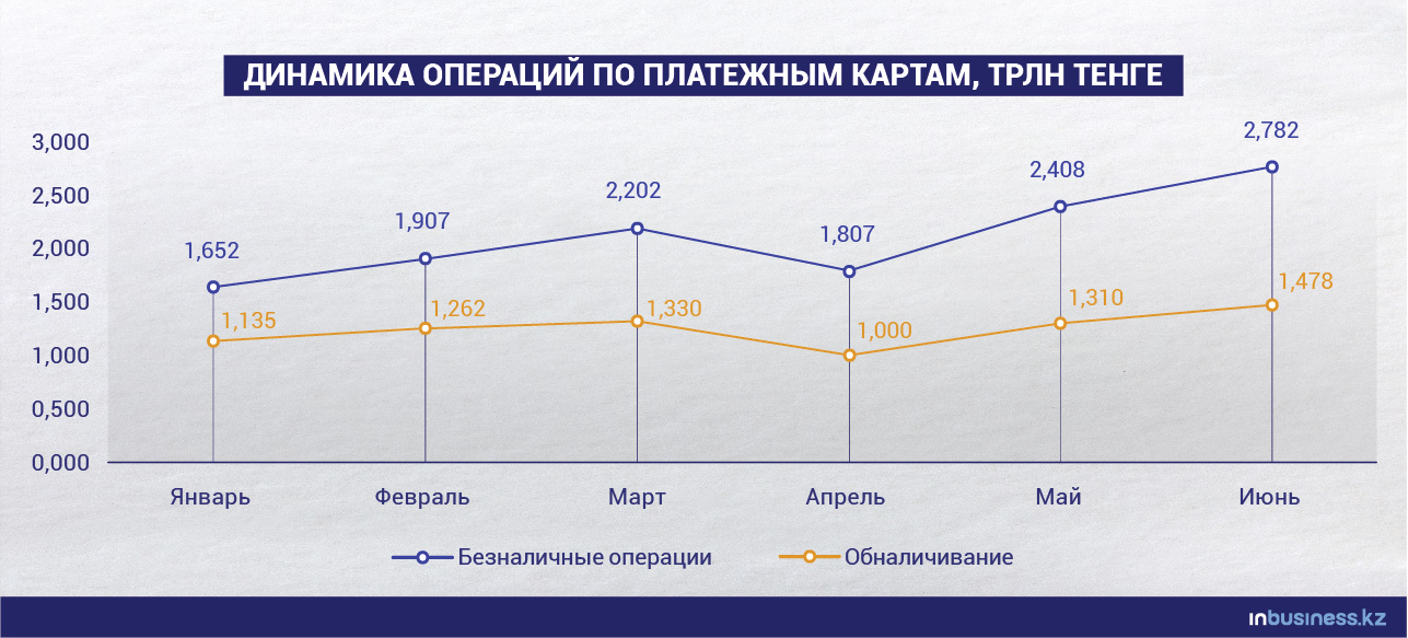 В Казахстане продолжается рост безналичных транзакций, их объем за первое полугодие составил 12,757 трлн тенге, что в 2,5 раза больше, чем за аналогичный период 2019 года. Для сравнения: по итогам прошлого года совокупная сумма безналичных операций составила 14,1 трлн тенге.