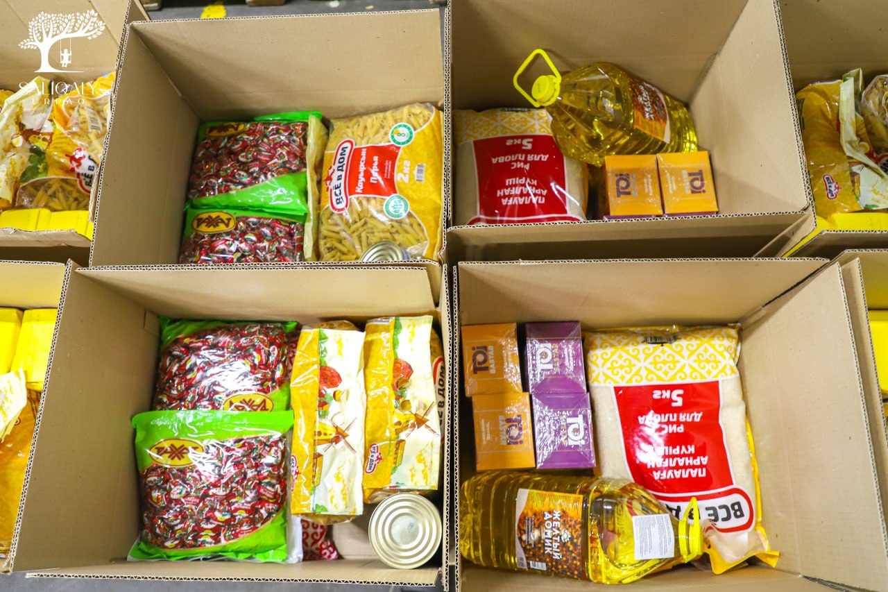 Так, от Фонда Болата Назарбаева каждой семье будет доставлена продуктовая корзина, состоящая из трех коробок с мясными консервами, разными крупами, мукой, маслом, кондитерскими изделиями и многим другим общим весом 50 килограммов. Для расфасовки и доставки наборов привлечены волонтеры.