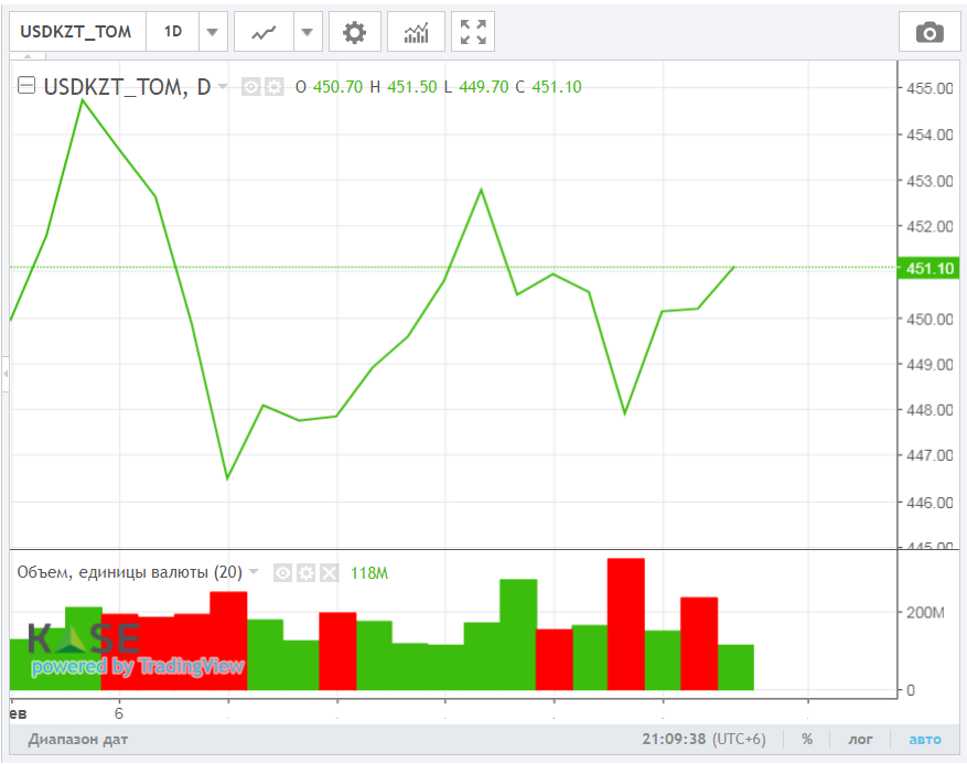 Среднедневной объем торгов на Казахстанской фондовой бирже в феврале по сравнению с январем увеличился со 172 млн до 187 млн долларов. При этом общий объем торгов за месяц составил 3,9 млрд долларов. Что касается сегодняшних торгов, то в первый день весны торги по валютной паре доллар/тенге стартовали при 451,30 тенге за доллар. В течение дня тенге торговался в диапазоне 450,50-451,85 тенге за доллар. Последняя на данный момент сделка была закрыта при 451,85 тенге за доллар. По состоянию на 15:30 по времени Астаны в ходе торгов на Казахстанской фондовой бирже было проведено 292 сделки на общую сумму в 129,6 млн долларов, что характеризуется крайне низким объемом торгов. Как итог официальный курс Нацбанка на ближайшие дни составил 451,03 тенге, что примерно на 1 тенге выше результата прошлой недели. В целом же за февраль доллар подорожал почти на 3 тенге.