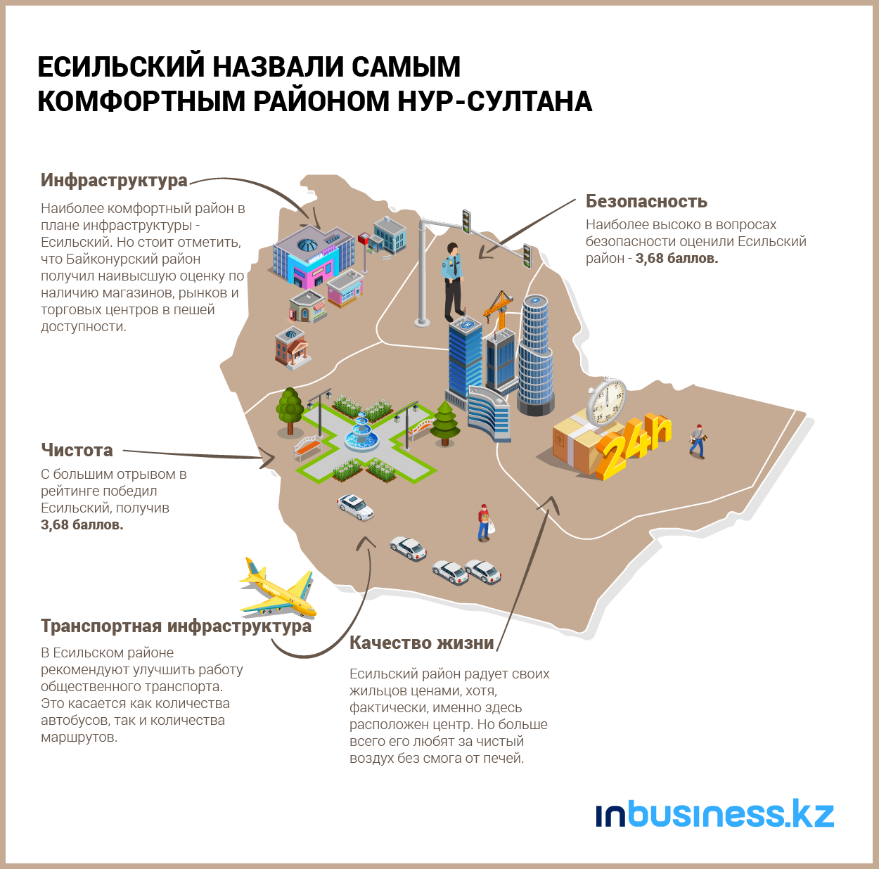 Наиболее комфортным районом в плане инфраструктуры назвали Есильский. Но стоит отметить, что Байконурский район получил наивысшую оценку по наличию магазинов, рынков и торговых центров в шаговой доступности.