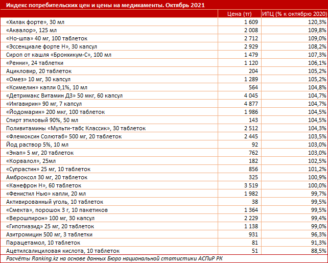 Среди лекарственных средств, входящих в мониторинг БНС АСПиР РК, сразу на 20,3% вырос в цене "Хилак форте" — до 1,6 тыс. тг за 30 мл. "Аквалор" 125 мл подорожал на 9,8%, до 2 тыс. тг, "Но-шпа" 40 мг 100 таблеток — на 9% до 2,7 тыс. тг, "Эссенциале форте Н" 30 капсул — на 8,2%, до 2,9 тыс. тг, сироп от кашля Бронхикум-С 100 мл — на 7,3%, до 1,5 тыс. тг.