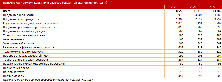 В сравнении с аналогичным периодом предыдущего года наблюдался рост в следующих сегментах: в продаже сырой нефти (плюс 882 млрд тг), продаже нефтепродуктов (плюс 1 225 млрд тг), грузовых железнодорожных перевозках (плюс 96 млрд тг), продаже урановой продукции (плюс 297 млрд тг), авиаперевозках (плюс 160 млрд тг), электрическом комплексе (плюс 24 млрд тг), реализации аффинированного золота (плюс 224 млрд тг), телекоммуникационных услугах (плюс 40 млрд тг), переработке давальческой нефти (плюс 1 млрд тг) и пассажирских железнодорожных перевозках (плюс 32 млрд тг).