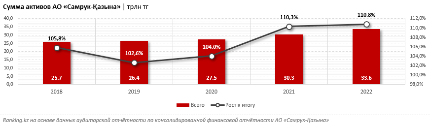 В целом по итогам 2022 года сумма консолидированных активов АО "Самрук-Қазына" достигла 33,6 трлн тг — на 3,3 трлн тг (или на 10,8%) больше по сравнению с аналогичным показателем предыдущего года. Такой рост является максимальным за последние годы. За пятилетний период активы фонда растут в среднем на 6,7% в год.