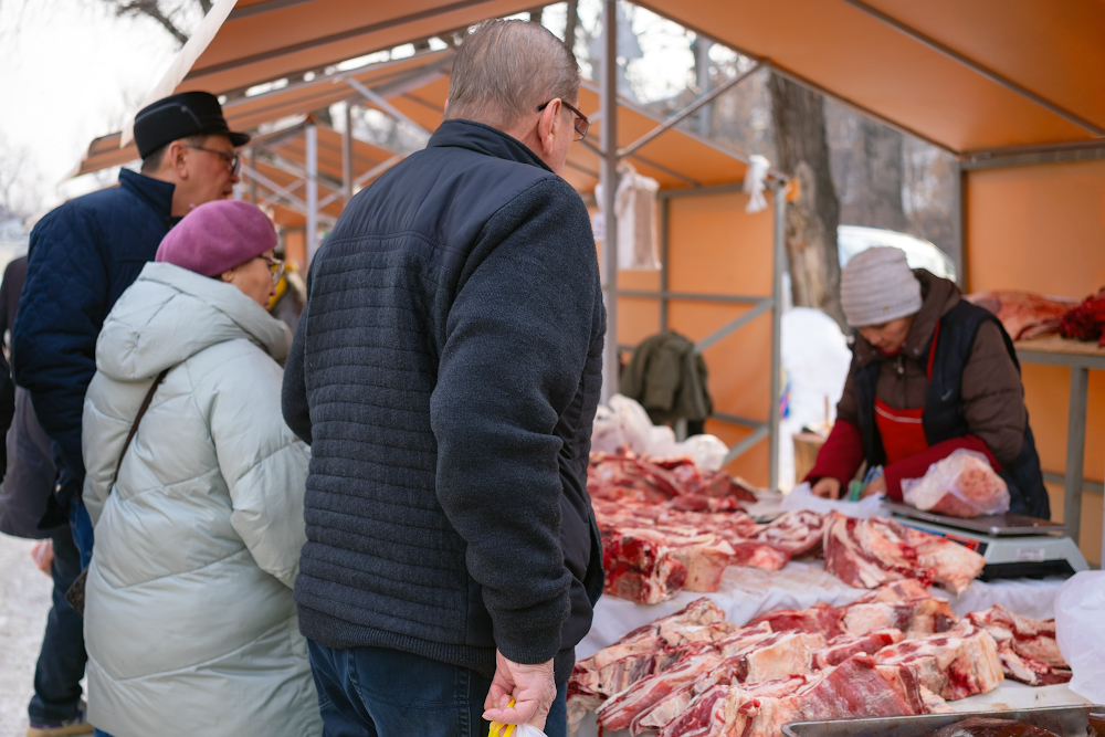 На городской продовольственной ярмарке "выходного дня", в одном из районов Алматы, говядину можно было приобрести сразу на нескольких прилавках. Большинство реализаторов мяса держали одинаковые цены, которая отличалась в зависимости от того, кусок какой части туши пожелал приобрести посетитель ярмарки.