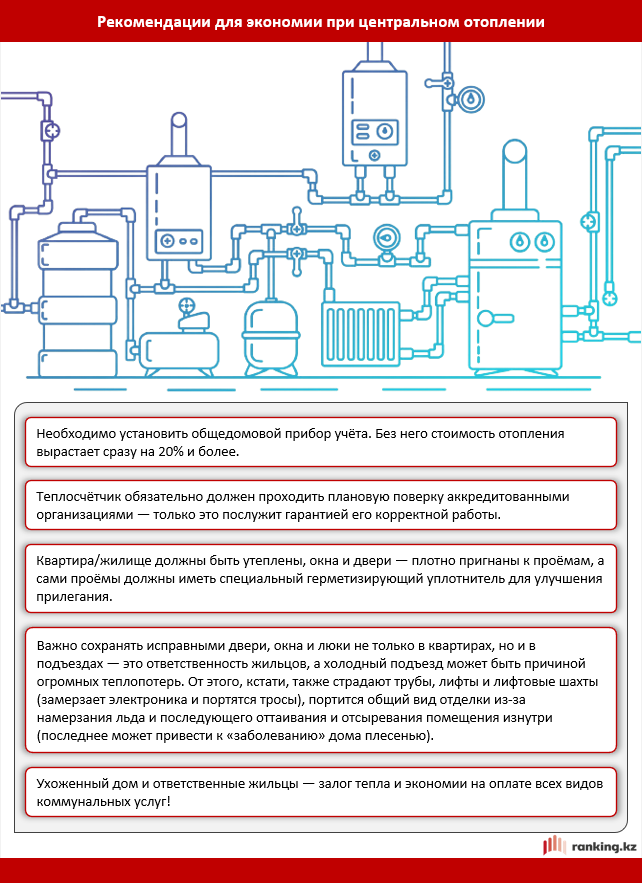 Что касается стоимости центрального теплоснабжения, в Казахстане она зависит от площади отапливаемого помещения и температуры на улице. И здесь работают свои принципы экономии.
