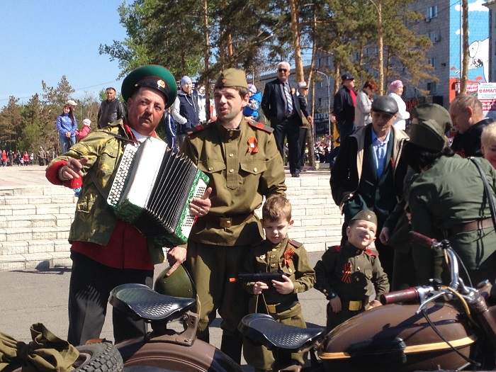 "Наш дед из числа репрессированных немцев. Но, тем не менее, он вел свою войну в тылу, помогая тем, кто был на передовой. Для этого дня я специально восстановил мотоцикл "Урал" 1972 года выпуска. Пошили форму всем членам семьи. В общем, моя жена Татьяна, малолетние сыновья Александр и Давид встречают праздник во всеоружии".