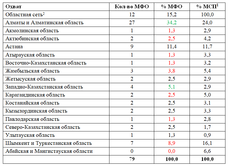 Таблица 1. Географическое распределение бизнес-МФО (и их филиалов) в Казахстане