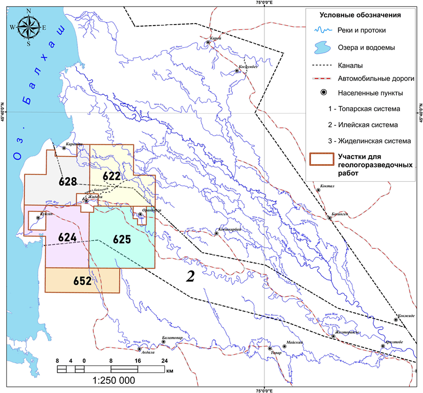Площадки, отведенные под геологоразведочные работы на карте гидрографической сети в дельте реки Или