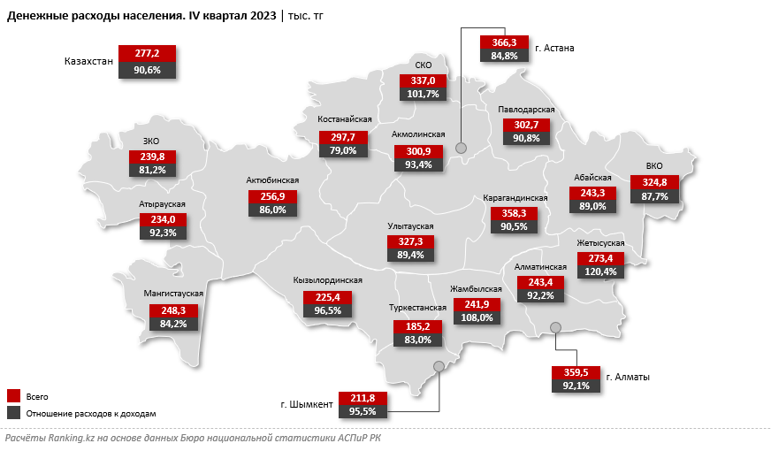 Среди регионов РК самые большие расходы в четвертом квартале 2023 года понесли жители мегаполисов, Астаны и Алматы: 366,3 тыс. и 359,5 тыс. тенге на душу населения соответственно. При этом в Астане расходы населения выросли сразу на 21,9% за год (самый высокий показатель среди регионов РК), а в Алматы — на 11,6%.