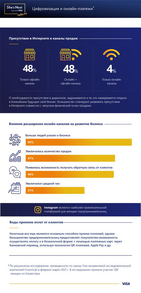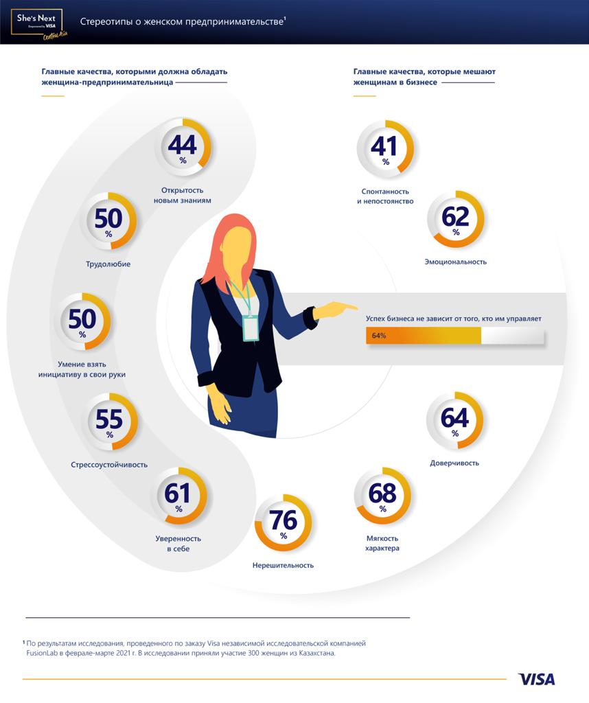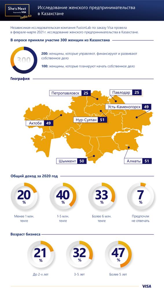 Visa представила результаты исследования, проведенного компанией FusionLab среди женщин-предпринимательниц из 7 городов Казахстана – Нур-Султана, Алматы, Шымкента, Павлодара, Петропавловска, Актобе и Усть-Каменогорска[1]. Результаты исследования определили особенности женского предпринимательства в Казахстане, основные причины для открытия своего дела, проблемы и стереотипы, с которыми предпринимательницы встречаются в повседневной деятельности, а также ключевые вызовы, с которыми столкнулся микро-, малый и средний бизнес в период пандемии. Исследование проводилось в рамках центральноазиатской волны глобальной инициативы She’s Next. Empowered by Visa, направленной на поддержку женщин в бизнесе, которые управляют, финансируют, развивают или только планируют начать собственное дело.