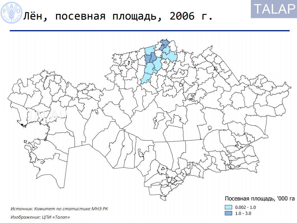 Временной отрезок, выбранный Дауреном Ошакбаевым в проведенном им исследовании по заказу ФАО по масличным и бобовым с 2006 по 2016 год, показывает, что в Казахстане сейчас очень хорошо выращивается лен. По прогнозам аналитика, скорее всего, он будет продолжать оставаться казахстанской культурой.