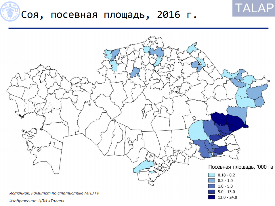 "Соя – очень удобная культура для производства, севооборотов. Достаточно большие усилия производит "ЭФКО", есть другие игроки – "Уыз Май Industry" (переработчики сои. – Ред.). Появился огромный спрос со стороны птицефабрик: они сами закупают сою, производят сою, потребляемую на кормах. У нее очень широкий спектр переработки, разнообразный. Соевое масло не настолько драйвер, насколько соевый белок", – пояснил национальный консультант ФАО в ходе дискуссии после презентации.
