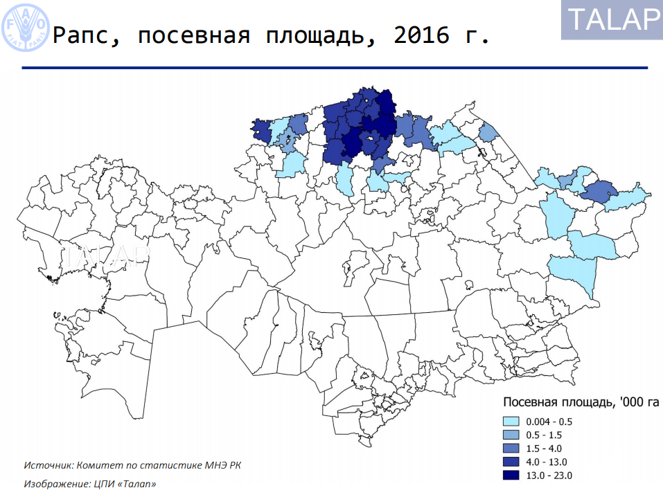 "По рапсу мы видим большую волатильность. В 2010 году посеяли очень много и получили плохой урожай. Это очень сильно разочаровало сельхозпроизводителей. Культура очень капиталоемкая, для нее нужно очень много оборотов, все производители жалуются, что за нее берутся все, кому не лень. В 2016 году остались известные производители в СКО – "Атамекен-Агро, "Казэкспортастык". Очень сильно начинается производство в Восточно-Казахстанской области, где происходит эксперимент с озимым рапсом, и вроде говорят, что результаты очень хорошие и многообещающие", – рассказал консультант ФАО в ходе презентации своего исследования на конференции.