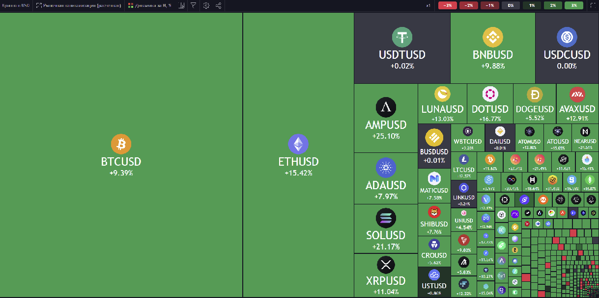 В итоге многие из альткоинов даже обошли биткоин по росту. Например, Terra по итогам последней недели выросла на +11,72%, Polkadot на +15,85%. Лидером же недели среди топовых криптовалют стала Solana, прибавившая почти +21%. В результате этого индекс доминирования биткоина за последние семь дней снизился на 0,49 процентных пункта - с 42,50% до 42,01%.