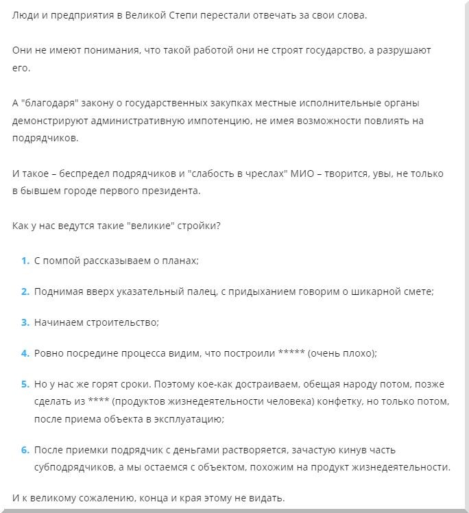 Там же была высказана мысль, что такой своей работой и "величайшие в мире строители", и местные исполнительные органы не строят, а разрушают государство. Походя (или специально) формируя у населения негативное отношение к власти.