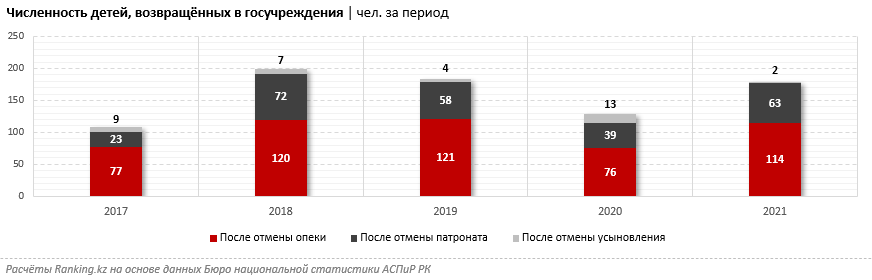В то же время, по мнению психологов Национального агентства по усыновлению РК, основной причиной возврата ребенка в детдом являются трудности с адаптацией в семье, и чаще всего возвраты происходят через какой-то небольшой период после усыновления. Поэтому уместно будет сделать сравнение не с общим количеством устроенных ребят, а только с теми, кого усыновили или взяли под опеку в течение того же года. В таком случае, если предположить, что большинство "отказных" детей были возвращены почти сразу, выходит, что в 2021 году в новых семьях не прижился едва ли не каждый третий устроенный ребенок (прямое соотношение численности возвращенных в госучреждения детей к численности попавших в семьи составляет 27,6%). Пятью годами ранее их доля была значительно меньше — 13,9%.