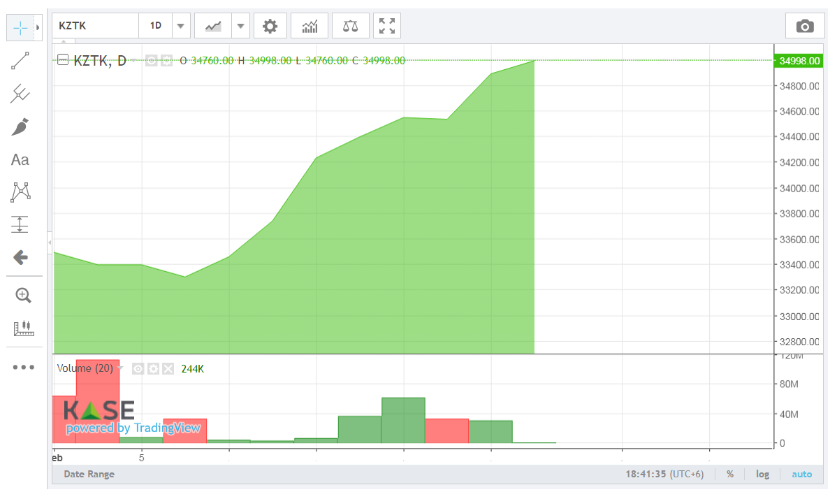 На фоне таких ожиданий цены на акции "Казахтелекома" (KZTK) начали расти. С начала февраля по состоянию на 16 февраля они уже выросли более чем на 4,5%, почти до 35 тыс. тенге. Еще больший рост бумаги демонстрируют на дистанции последней недели. За это время акции KZTK подорожали примерно на 5,5%.