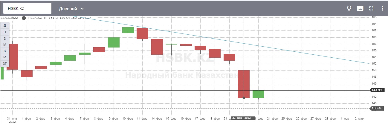 Естественно, что уже на следующий день, 22 февраля, аккурат перед выступлением Джо Байдена волна перекинулась на KASE. Акции Народного банка со 153 тенге за бумагу улетели в район 140 тенге, потеряв более 8%.