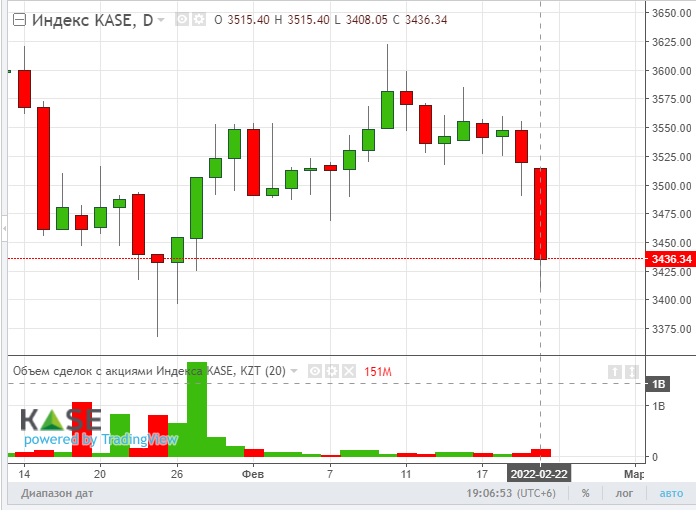 21 февраля американские площадки были закрыты в связи с празднованием дня рождения Джорджа Вашингтона (третий понедельник февраля). Именно в этот день поздно вечером Владимир Путин признал независимость ДНР и ЛНР. Это привело к резкому выходу из рисковых активов. Говоря об акциях казахстанских эмитентов, то в первую очередь попали под раздачу, а точнее, под распродажу, бумаги, листингованные на Лондонской фондовой бирже (LSE). Это Народный банк, Каспи банк и "Казатомпром". Их котировки рухнули на 5,2-8,2%. Особенно упали ГДР (глобальные депозитарные расписки) Народного банка (HSBK.EU). С $13,64 на открытии до $12,52 на закрытии (-8,21%). Хотя в целом лондонский FTSE в целом потерял чуть менее 0,5%.